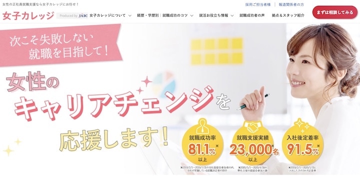 女子カレッジは社会人経験の少ない女性を対象としたキャリアチェンジ応援サービス。女性に特化した就職講座が無料で受講でき、女性に人気な職種への就職が実現できると評判のサービスです。
