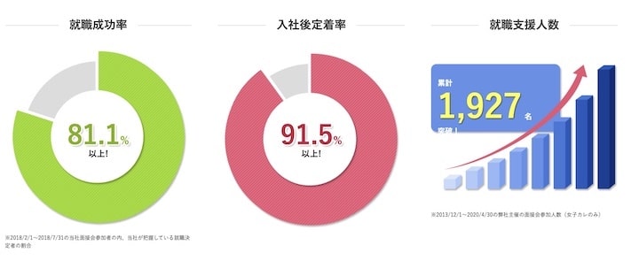 運営会社のノウハウを生かした丁寧な指導や経験豊富なスタッフによる手厚いサポートで、就職成功率は81.1%以上。入社後の定着率も91.5%と利用価値の高いサービスです。