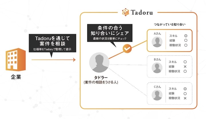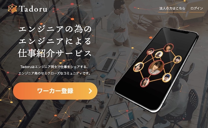株式会社リビルドが運営するTadoruは、エンジニア同士で仕事のシェアができる案件紹介型サービスです。