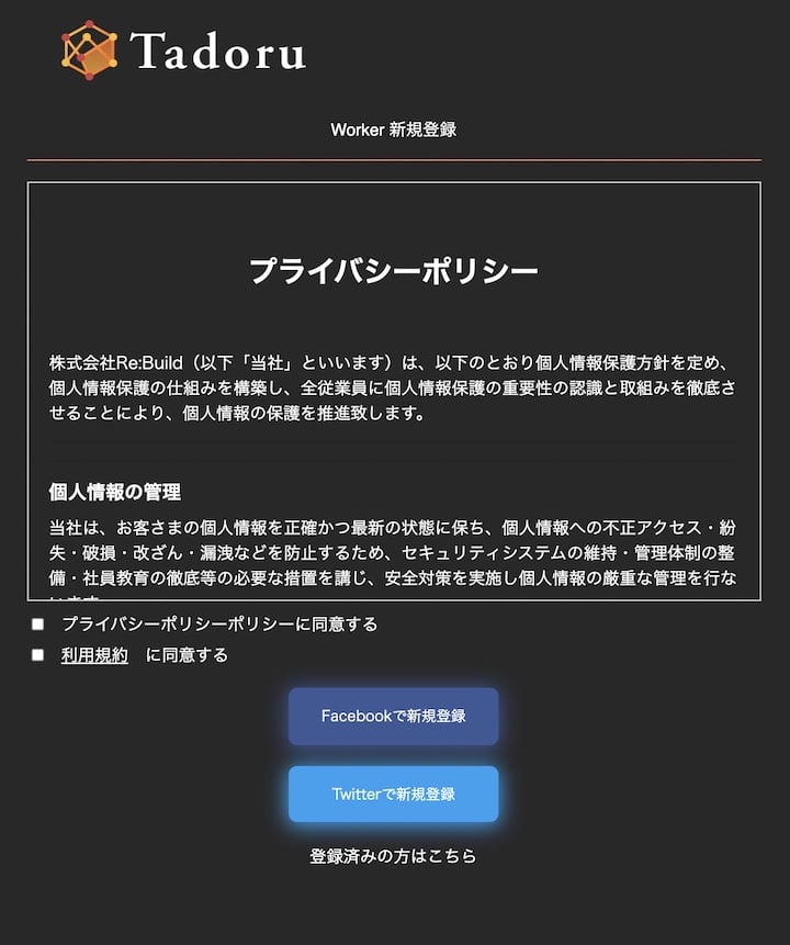 ・「利用規約に同意する」をチェック・「Facebookで新規登録」または「Twitterで新規登録」のいずれかを選択する