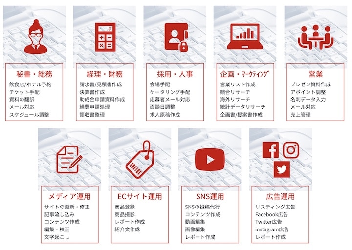 秘書・総務/経理・財務/採用・人事/企画・マーケティング/営業/メディア運用/ECサイト運用/SNS運用/広告運用