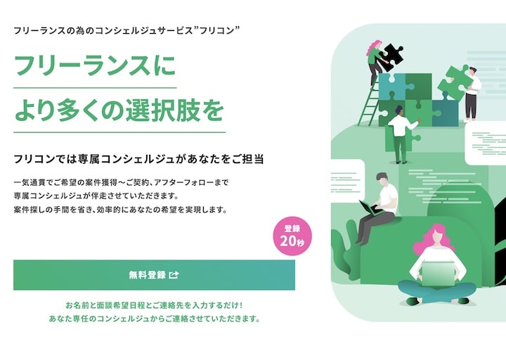 しかしフリコンは、専任コンシェルジュが面談・案件紹介から稼働中のサポートまで担当。一人の担当者とじっくり関わることができるため信頼関係が構築でき、不安や悩みをその都度相談しながら円滑に仕事を進められるでしょう。