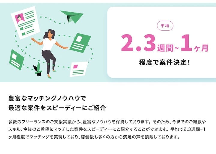 フリコンは案件決定までの期間が短いことも特徴です。平均2.3週間~1ヶ月程度で案件が決定するため、スピーディに案件に参画できます。