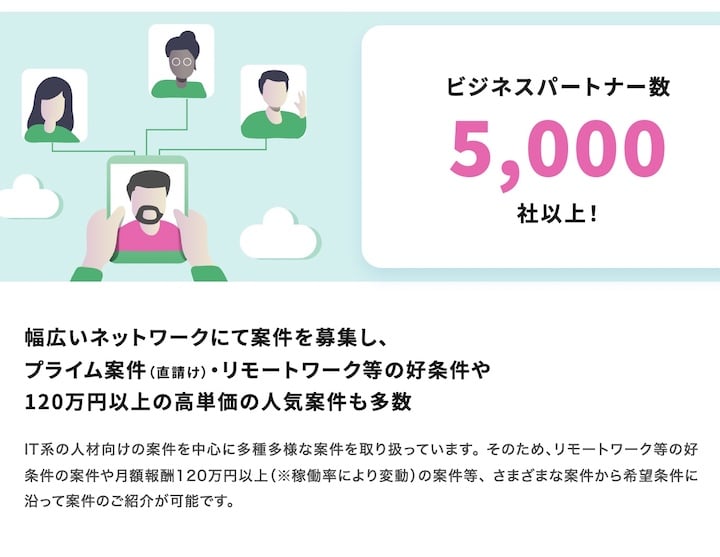 クライアント企業と直接契約できるプライム案件や月額報酬120万円以上の高単価案件、リモートワーク案件など、さまざまな案件を保有しています。