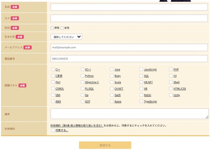 FAworksは公式サイトから案件への申し込みが可能です。応募の際には以下の項目への入力が必須となります。
