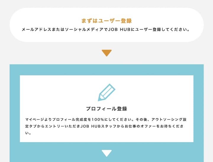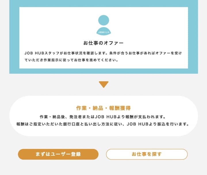 プロフィールで実績やスキルをアピールし、JOB HUBで実績を貯めると優先的に仕事の案内がくるようになる仕組み。