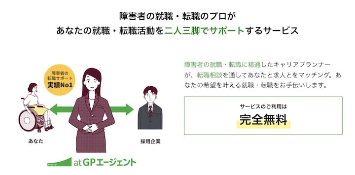 at GPエージェントは、障がいを持っている人々の就職・転職を支援するサービス。障がい者の転職サポート実績NO.1を誇る、業界のパイオニア的存在です。