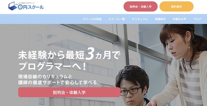 0円スクールは未経験の人からでも現場で通用する知識の習得が可能。プログラミングでよく使われるJavaの基礎講座とWEBアプリケーション開発を体験できるのは他のサービスにはないメリット。