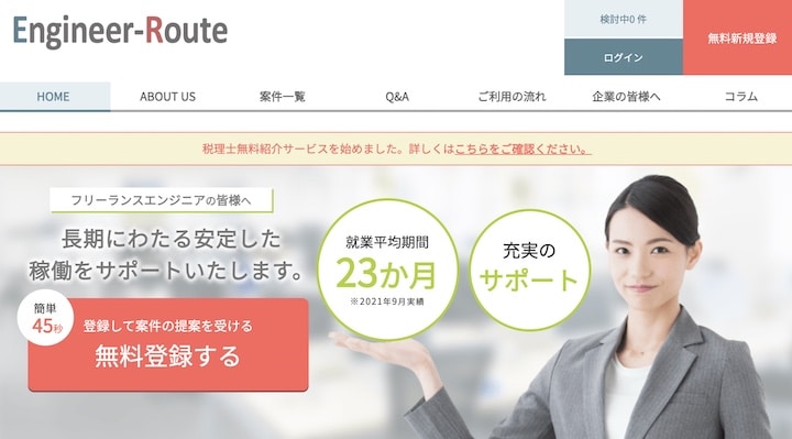 エンジニアルートは、フリーランスエンジニア向けのエージェントサービス。充実のサポートでフリーランスの就業平均期間20ヶ月と長期にわたる安定した稼働が実現可能と評判です。