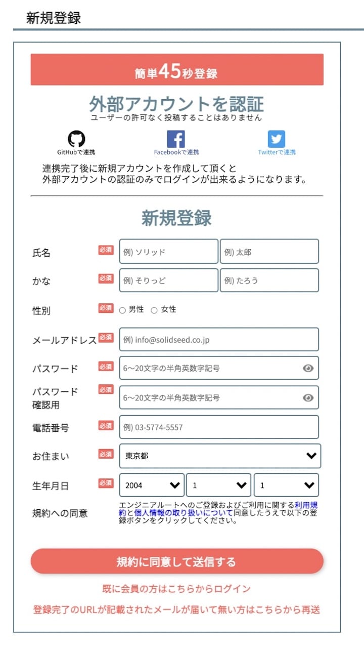 以上を入力のうえ、「規約に同意して送信する」をクリックします。