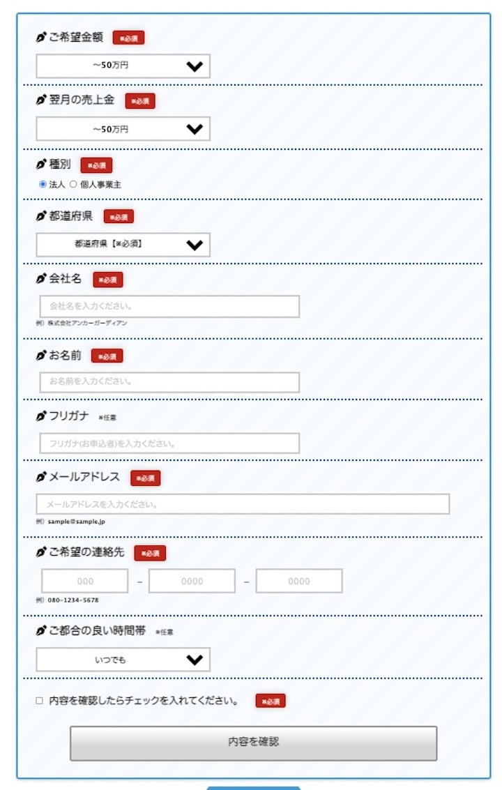申し込みフォームから申し込む場合の必須項目は以下のとおり。