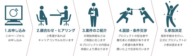 面談でのヒアリングをもとに、案件が紹介されます。希望の案件があればプロジェクトの担当者・責任者との面談を実施。希望条件などを交渉します。