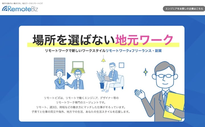 リモートビズとは、リモートで働くエンジニア、デザイナーのためのリモート専門のエージェントです。地方での生活、子育てと仕事の両立など自分の生活スタイルに合わせた案件が探せると評判のサービスです。