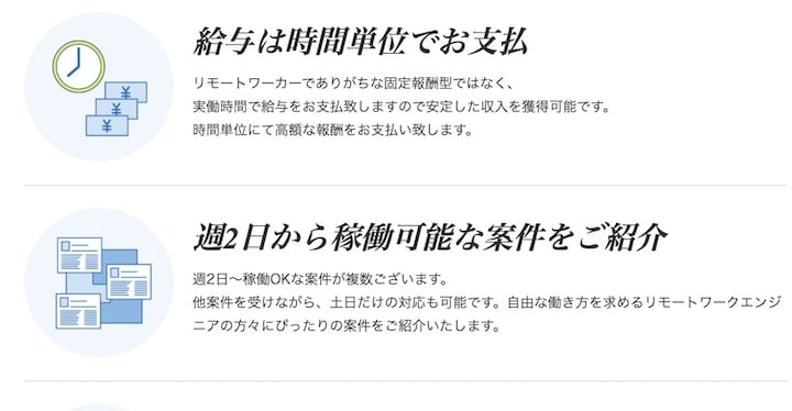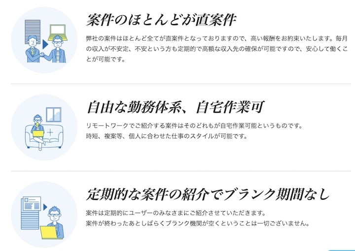 リモートビズの案件のほとんどすべてが直案件。仲介手数料が抑えられるため高い報酬が約束されます。収入に不安を感じがちなフリーランスでも安心です。