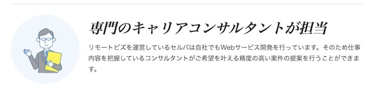 運営会社の株式会社セルバはWebサービス開発も手掛ける会社。そのためIT/Web業界に精通したコンサルタントが要望に沿った制度の高い案件を紹介してくれます。