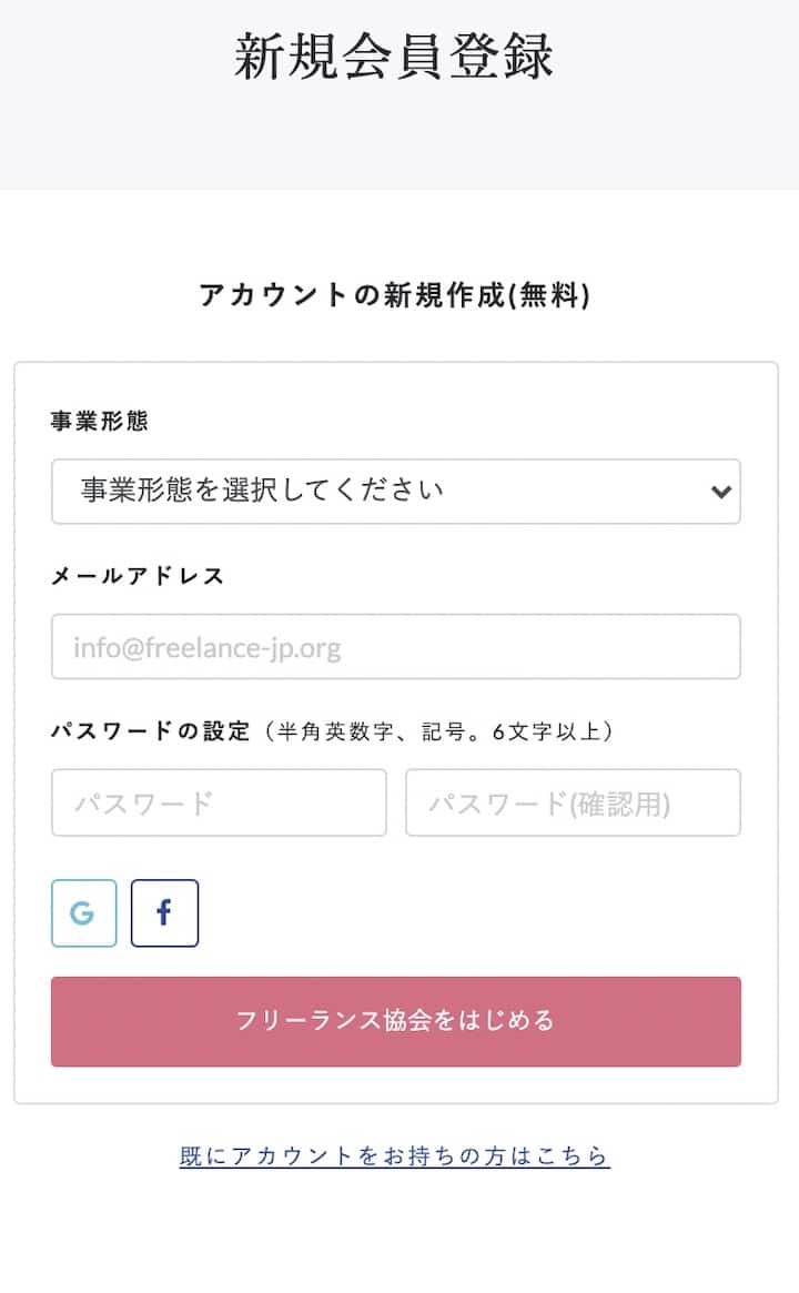 ・パスワード以上を入力し、「フリーランス協会をはじめる」をクリックします。