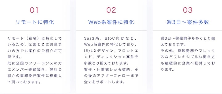 取り扱う案件の95%がリモート案件なので、地方に住んできながら都会の案件に挑戦できるのが特徴です。また週3日から勤務可能なので、外に働きにでられない主婦の人も案件探しがしやすいでしょう。