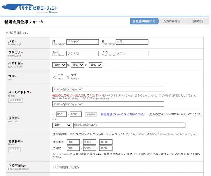 公式ホームページより無料会員登録します。入力項目は以下のとおり。