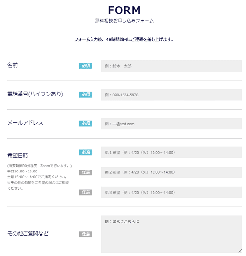 公式ホームページの無料相談申し込みフォームから申し込みます。
