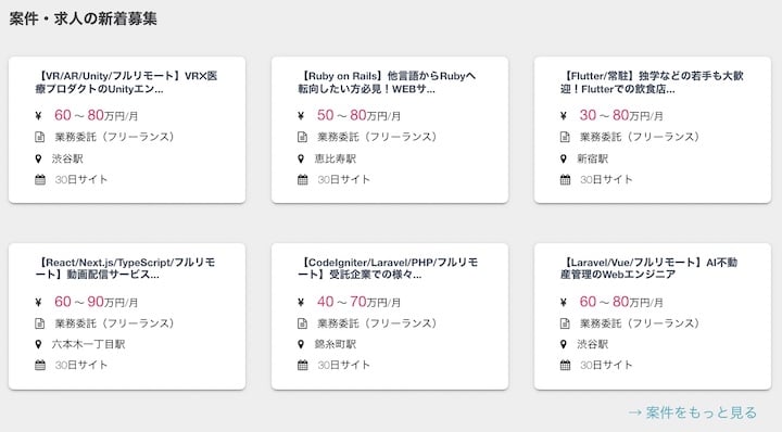 これらの他にも50種類以上の言語項目があり、幅広くエンジニア案件を取り揃えていることが伺えます。上記の数字は、あくまで公開されている案件だけ。